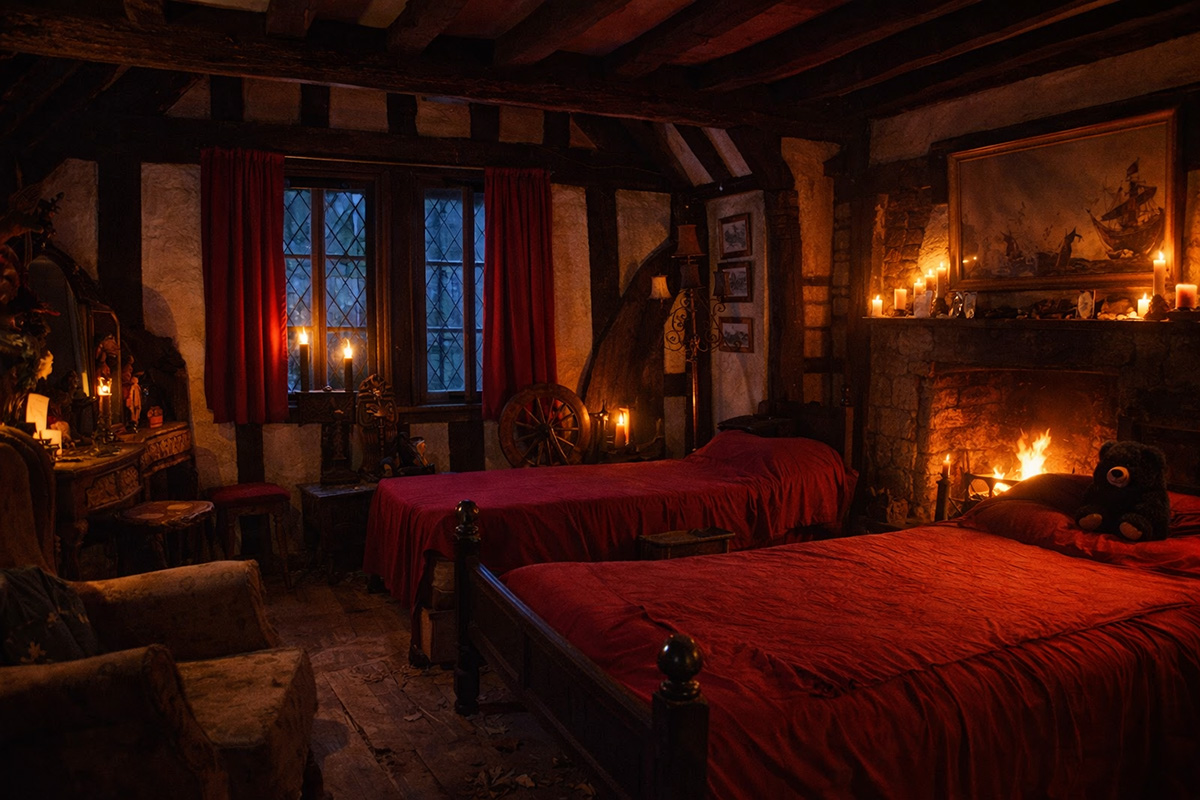 The door creaks open slowly, and the first thing that hits you is the cool, musty air that seems to carry the weight of centuries past. As you step inside, the wooden beams of the low ceiling press down, their age evident in the cracks and bends that have witnessed untold stories. The smell of damp stone and aged wood lingers, but there’s also something else—perhaps the faintest trace of smoke, as if a fire long extinguished still haunts the hearth. The atmosphere is thick with history, and though this is no restaurant, you feel as though you’ve been invited to take a seat at a table set by time itself.