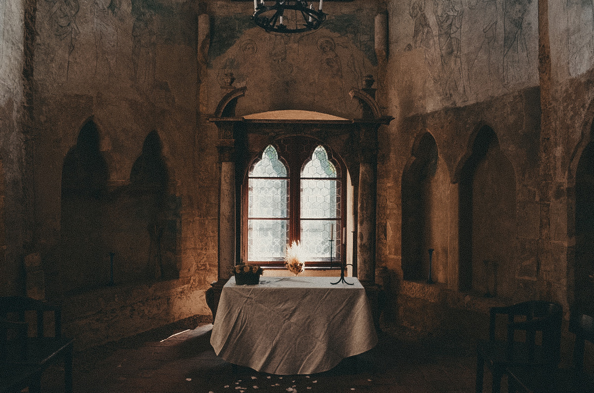 - Shadow figures moving across the chapel walls